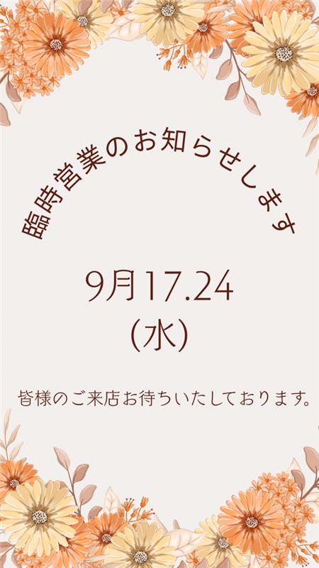 9月17日(水) 9月24日(水) ランチ及びディナー、臨時営業いたします。 ぜひ量平寿司にお越しいただき、江戸前寿司をお楽しみください。 (※通常、毎週水曜日は定休日)